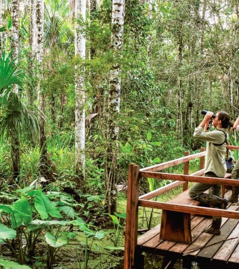 Next, a boat takes you into the Tambopata National Reserve. A five-kilometer hike leads to Sandoval Lake.